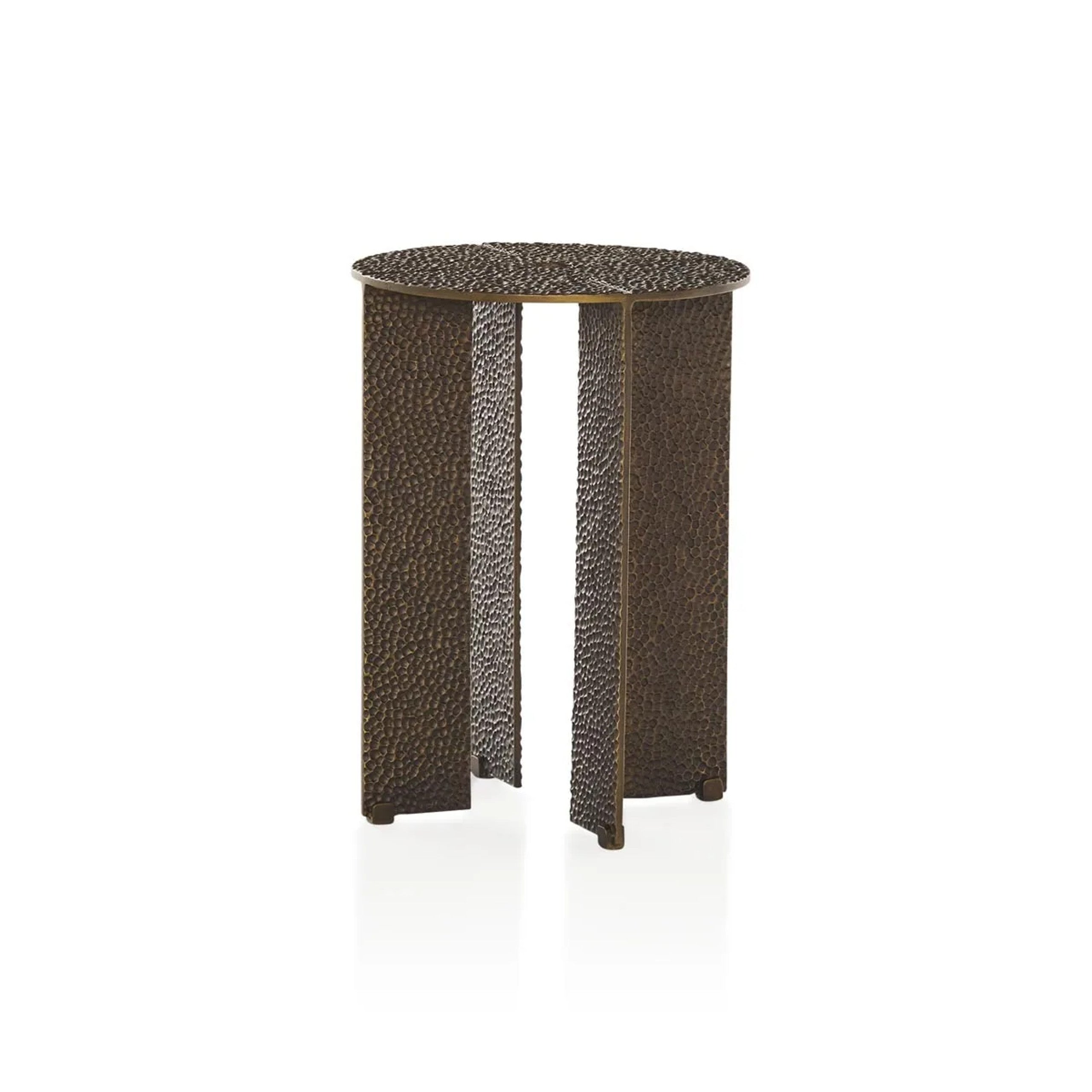 A circular table characterised by its solid textured hammered surface.|The Bowie Side Table is captivating with its strong and solid form made of cast aluminum. The hammered texture of this table plays with light and shadow as the bronze coloured finish adds a rich warmth to any interior. The material and texture of this table contribute an industrial flair to the overall design.