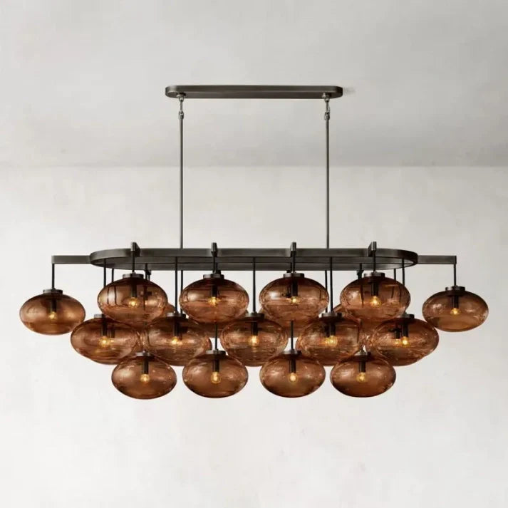 Introduce a touch of elegance to your space with the CABRETTE AMBER GLASS LINEAR CHANDELIER 72". The sleek design and high-quality amber glass exude sophistication and luxury. Illuminate your room with its warm glow, creating a cozy and inviting atmosphere. Perfect for adding a touch of class to any room.