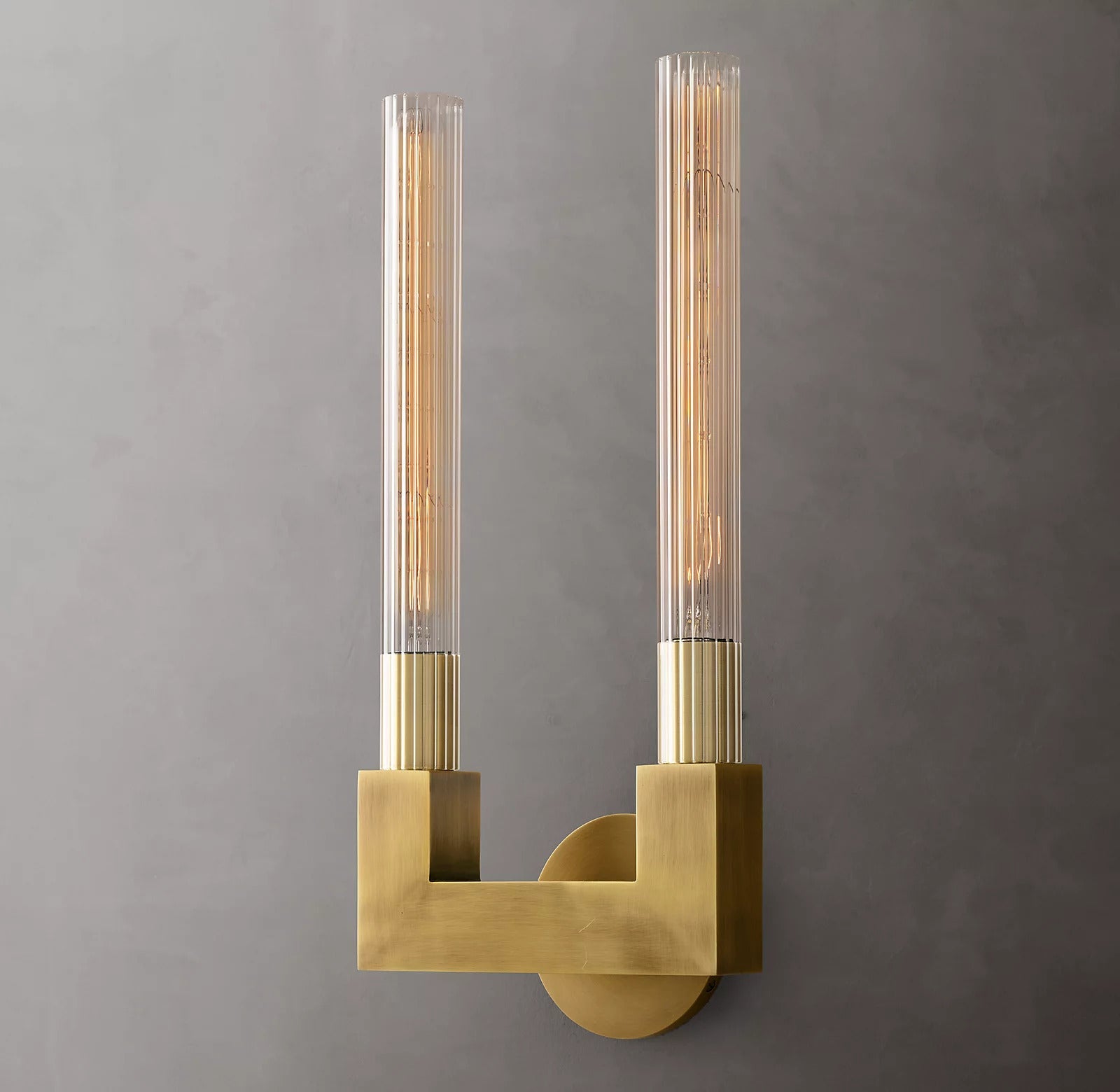 This Wall Sconce is a reinterpretation of the simple artistic chandelier form of solid brass. The lamp has simple lines and sharp angles. Its elegant prism Glass Hurricane shows an Edison filament bulb, which flashes like a candle.