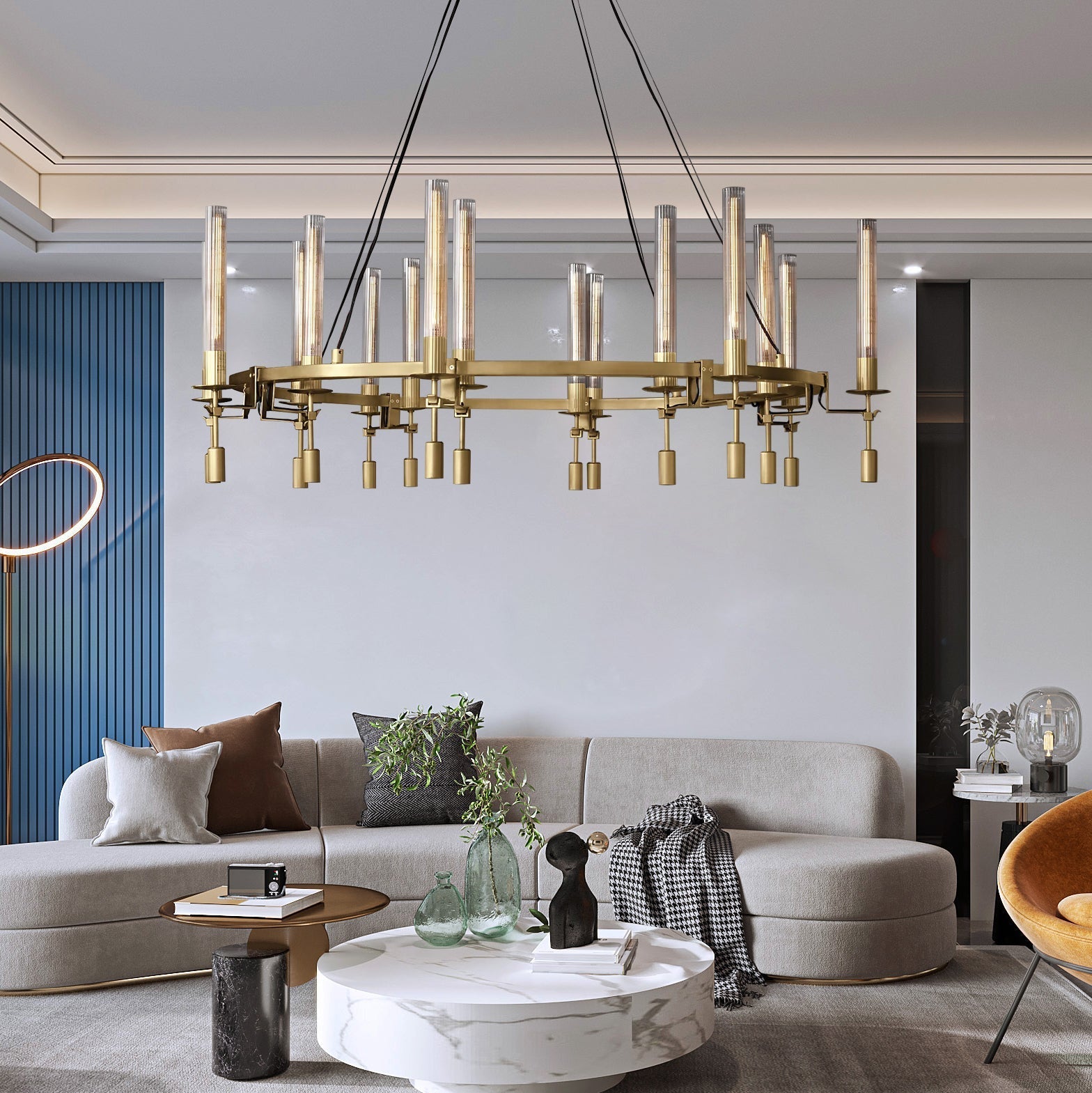 Our chandelier it is made of solid brass and its minimalist structure features Edison bulbs set in cylindrical ribbed glass, the crystalline glass transmits beautiful light that shines like a candle.