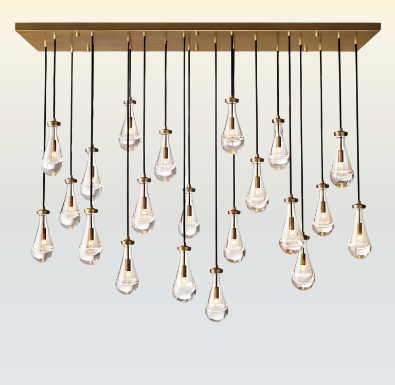 Each exquisite raindrop glass pendant combines high-quality copper elements to show luxury. Each raindrop pendant is carefully blown by workers with many years of manual experience. Ceilings, ceilings and fittings are made of solid brass. The transparent raindrop pendant reflects the warm light. It highlights the elegance and temperament of this chandelier.