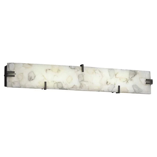 Isn’t it time your bathroom rocked a new look? Then update your loo with the Alabaster Rocks Clips LED Vanity Light. It unites a minimalist shape with a mosaic of shaved alabaster rocks cast into resin. Metal clips support the shade while creating a clean counterpoint to its translucent tones and natural textures.