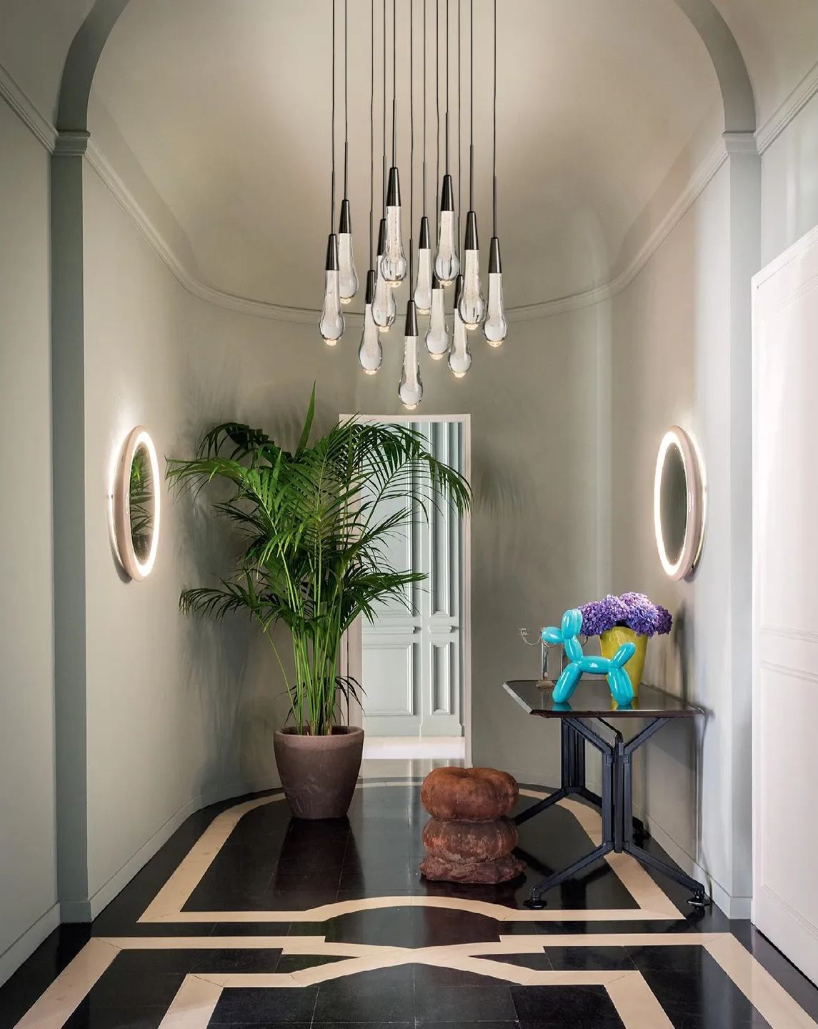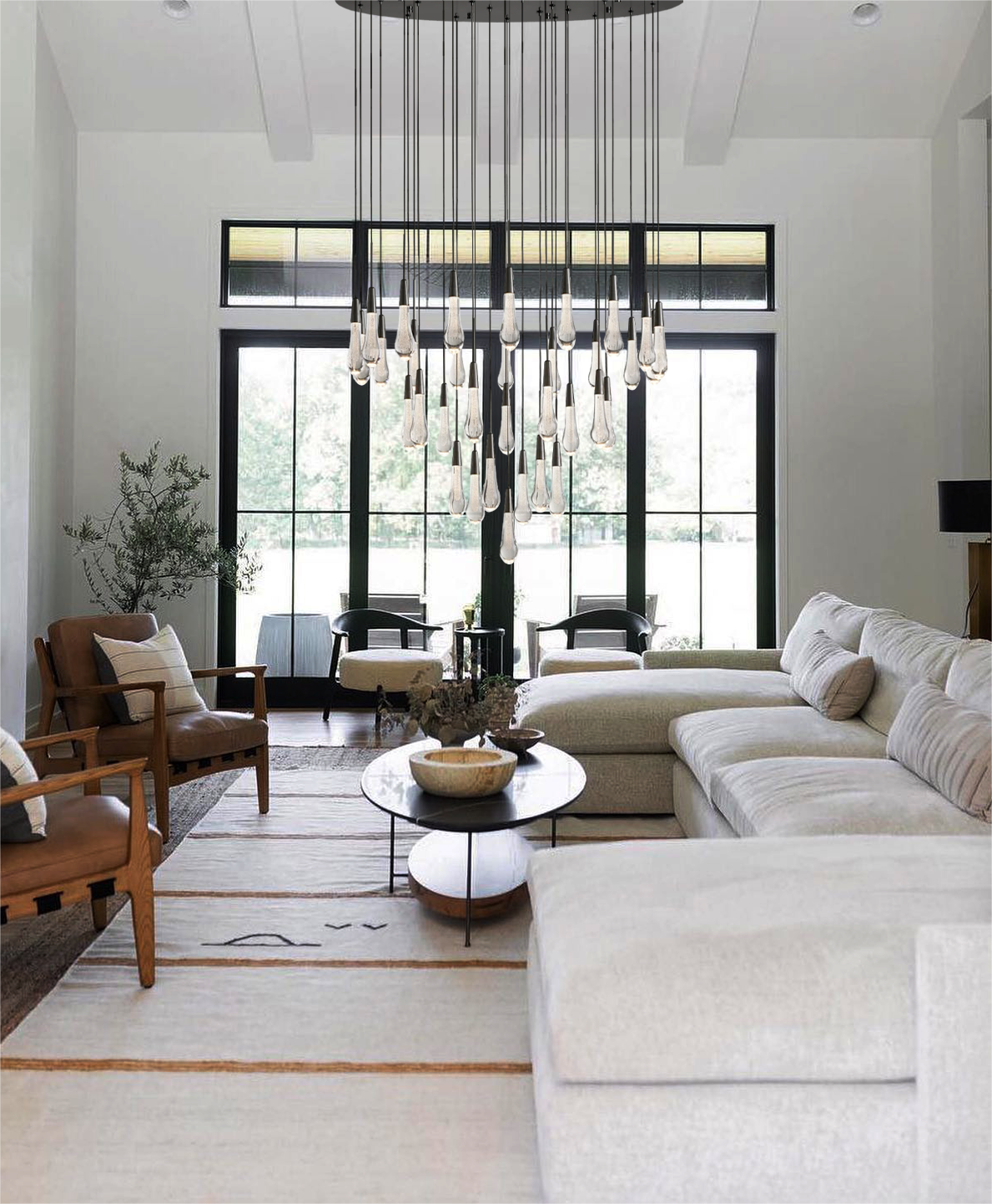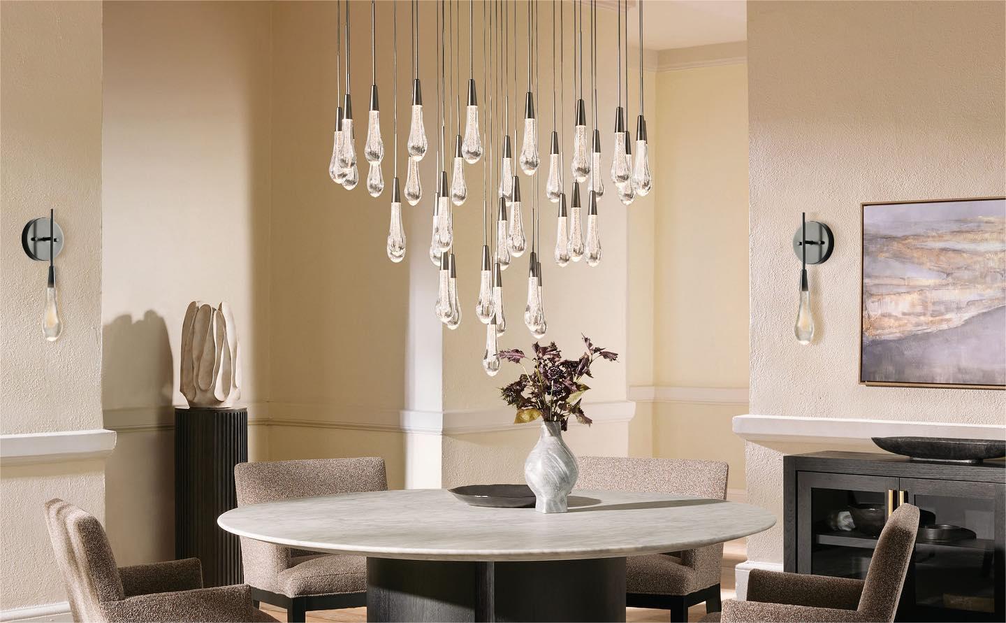 Enhance your space with the captivating Soltaire Round Chandelier. Crafted with care, this chandelier features adjustable black PVC cords gracefully flowing into integrated LED lights. The handcrafted seeded glass design effortlessly emulates the beauty of a glistening raindrop. Illuminate your surroundings with elegance and sophistication.