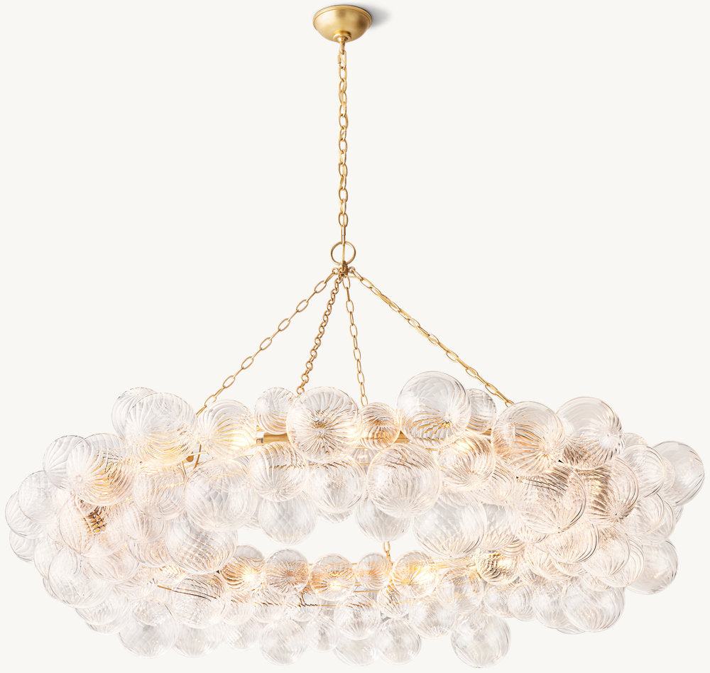 The Talia chandelier features a cluster of 221 blown swirled-glass orbs that appear weightless, floating like bubbles around a metal frame, reflecting ripples of light through the richly textured surface. Designer Julie Neill reimagines classic glass globe fixtures to create this elevated collection of distinctly modern statement pieces.