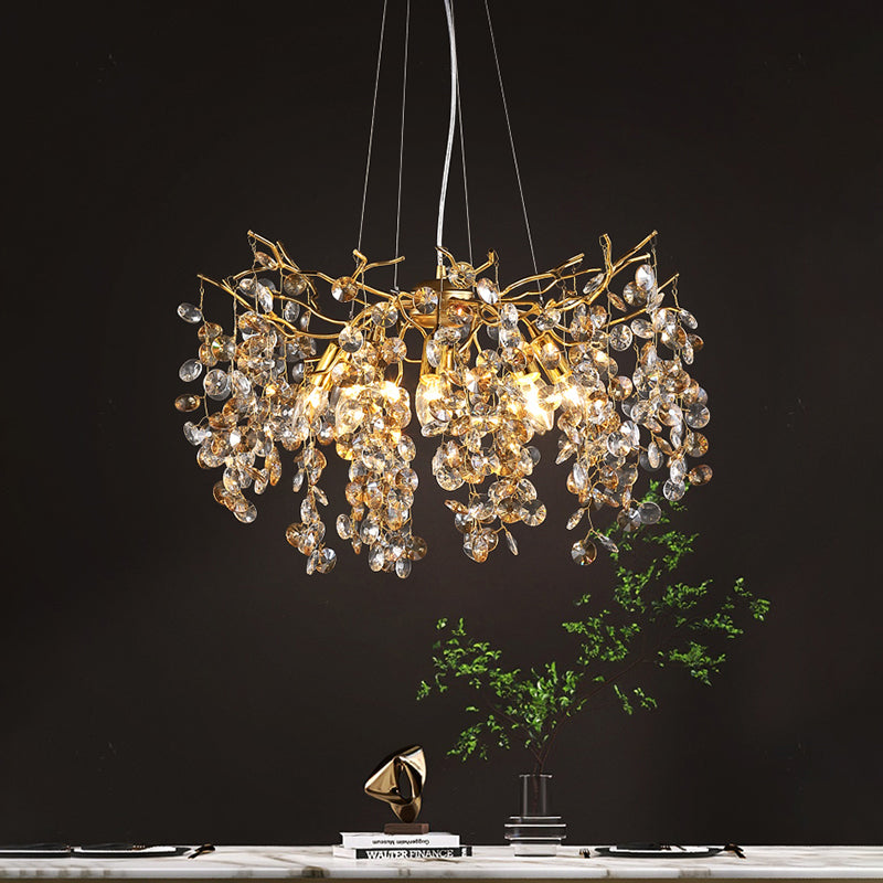Introducing the Modern Gold Crystal Chandelier adorned with sunflower-shaped crystal strings. The small round crystals sparkle, creating a stunning and beautiful visual effect. This Gold Chandelier Lighting is a fantastic choice for various spaces, including dining rooms, living rooms, wedding halls, entryways, foyers, hallways, bars, banquet halls, restaurants, two-story lofts, and hotel rooms. Its elegant design adds a touch of sophistication to any setting.